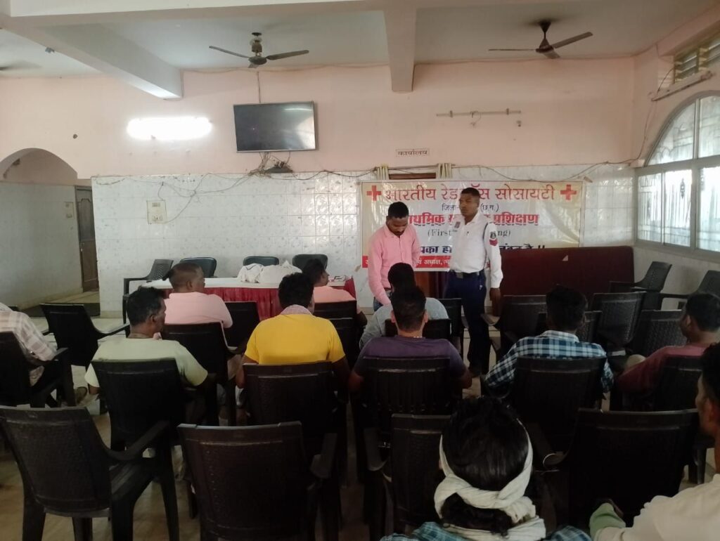 ➡️ जिला रेड क्रॉस सोसायटी के विशेषज्ञ डॉक्टरों व मास्टर ट्रेनरों की टीम दे रही थी, सड़क दुर्घटनाओं के दौरान प्राथमिक उपचार हेतु सड़क सुरक्षा मितानों को प्रशिक्षण