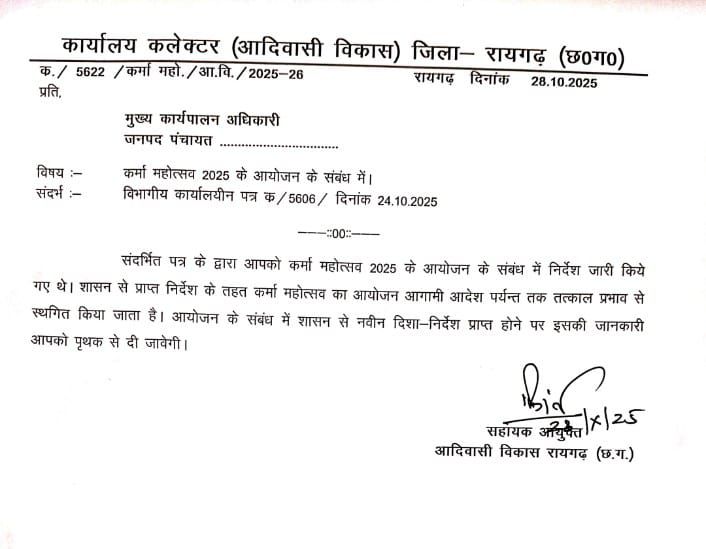 जिलेभर में बड़े उत्साह और तैयारी के साथ मनाए जाने वाले कर्मा महोत्सव 2025 पर अचानक प्रशासनिक ब्रेक लग गया है। कार्यालय कलेक्टर (आदिवासी विकास) रायगढ़ द्वारा जारी पत्र क्रमांक क./5622/कर्मा महो./आ.वि./2025-26 दिनांक 28.10.2025 के माध्यम से इस वर्ष का कर्मा महोत्सव तत्काल प्रभाव से आगामी आदेश तक स्थगित कर दिया गया है।