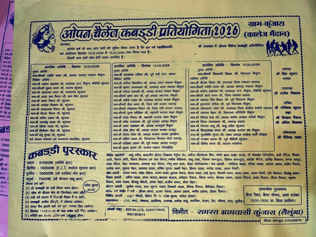 कुंजारा (लैलूंगा): खेल प्रेमियों के लिए एक बड़ी खुशखबरी सामने आ रही है। रायगढ़ जिले के लैलूंगा क्षेत्र अंतर्गत ग्राम कुंजारा में महाशिवरात्रि के शुभ अवसर पर भव्य ‘ओपन चैलेंज कबड्डी प्रतियोगिता 2026’ का आयोजन किया जा रहा है। यह रोमांचक प्रतियोगिता स्थानीय कॉलेज मैदान में 13 फरवरी से 15 फरवरी 2026 तक आयोजित होगी।
